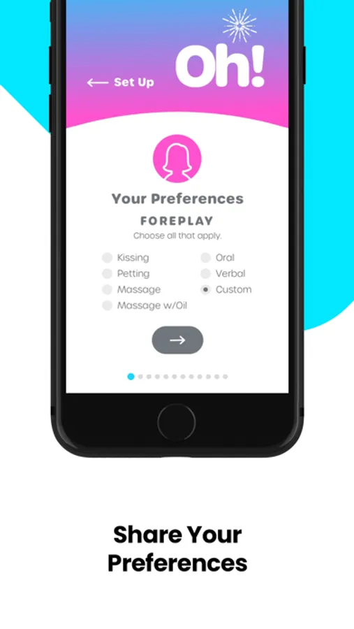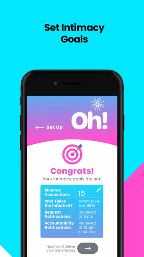 Oh! allows you to set intimacy goals based on you and your partner’s intimacy goals and preferences. Based on these goals, the app will send you and your partner request notifications that will help coordinate your intimate encounters. The app follows up with you the next day to make sure you’re keeping on the plan.