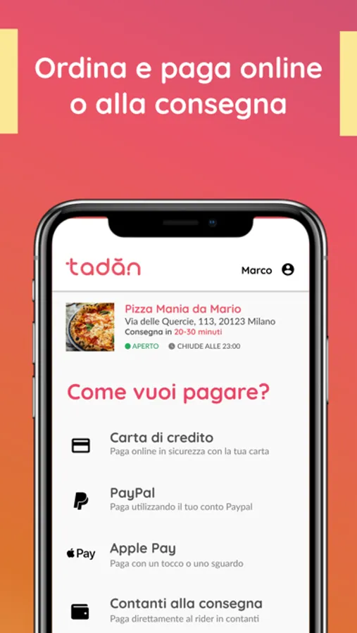 - Puoi scegliere di pagare comodamente tramite l'app o alla consegna al rider.