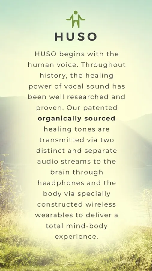 HUSO begins with the human voice. Throughout history, the healing power of vocal sound has been well researched and proven. Our patented organically sourced healing tones are transmitted via 2 distinct and separate audio streams to the brain through headphones and the body via specially constructed wireless wearables containing a crystal and LE bluetooth chip placed on major acupuncture meridians to deliver a total mind-body experience.