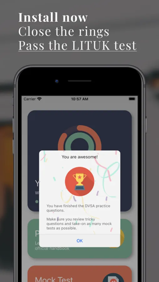 - Unlimited mock tests - Take the mock tests as many times as you like. We will track your scores. When the rings close, book the actual test!