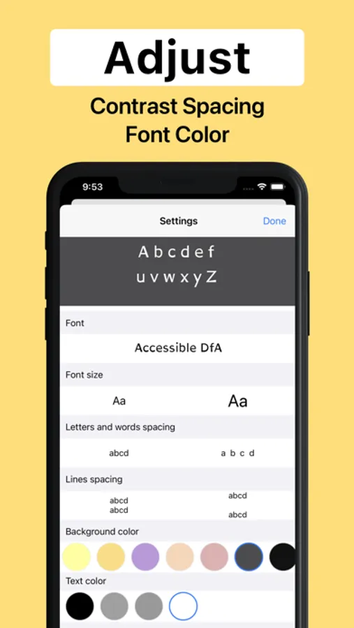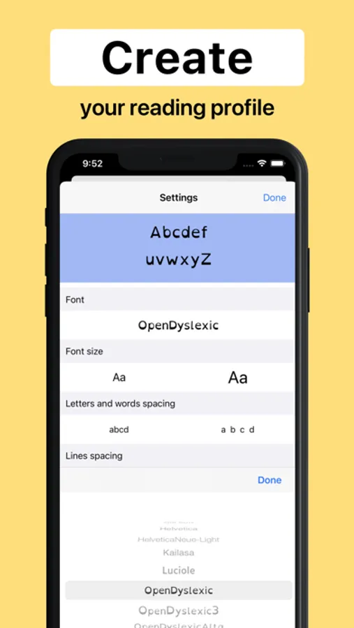 - Better distinction of letters, thanks to a wide choice of policies (Helvetica, OpenDyslexic, Andika Basic, Arial, Arial Rounded MT Bold, Chalkboard SE, Gill Sans, HelveticaNeue-Light, Kailasa, Optima, Trebuchet MS, Verdana)