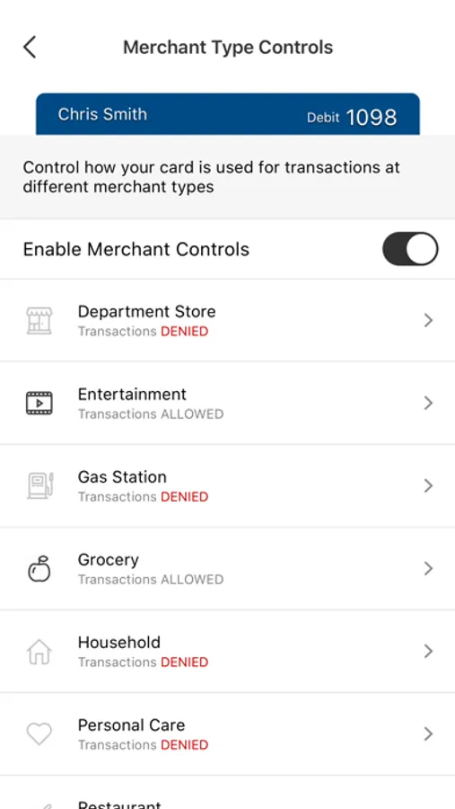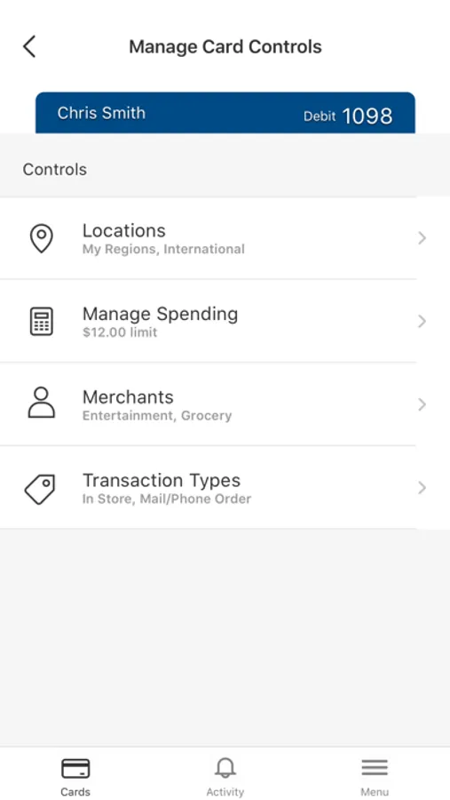 Set spending limits to decline transactions above your thresholds. Monitor activity by category such as gas stations and restaurants, and by type: in-store purchases, e-commerce transactions and ATM transactions.