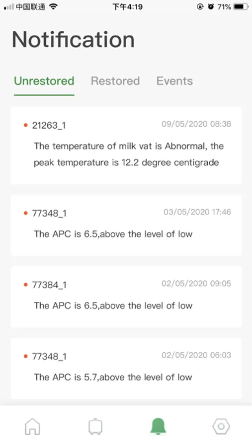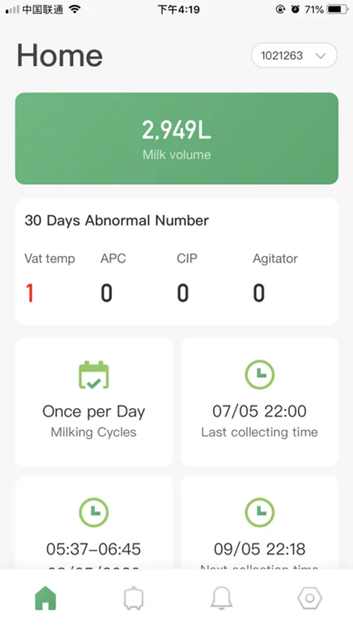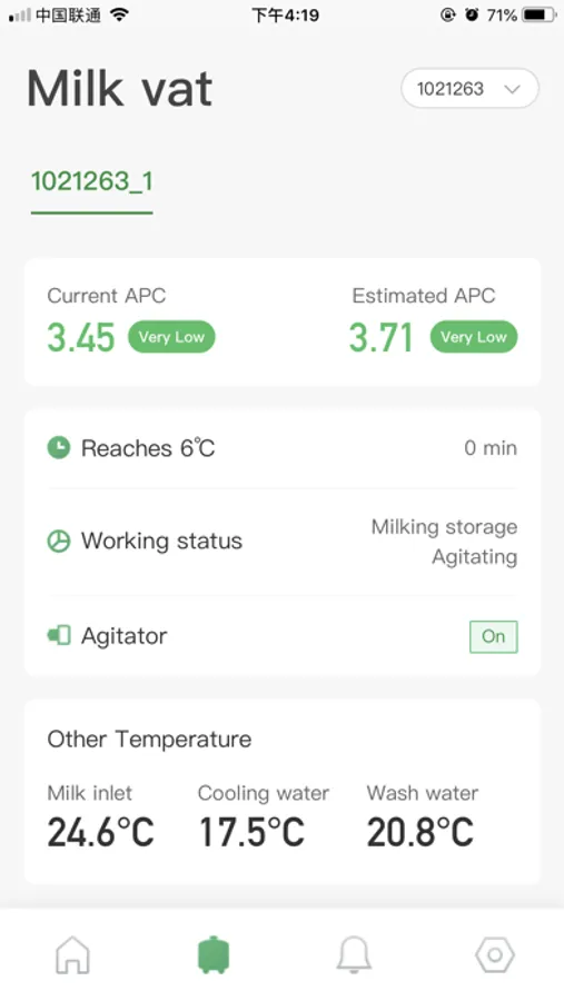 Milk Vat: View real-time data on the milk vat, including milk volume, temperature, operating status, and more.