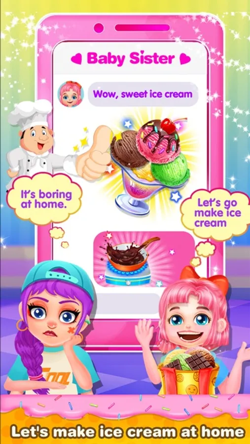 Look, your phone is ringing. The baby sister wants to have a chocolate ice cream. Let’s make one for her.