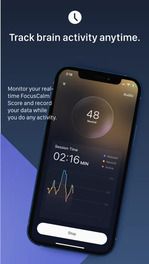 It starts with your FocusCalm score...a real-time display of your brain activity on a scale from 0 - 100. A low score means your brain is active or stressed. A high FocusCalm score means your brain is calm and tranquil.