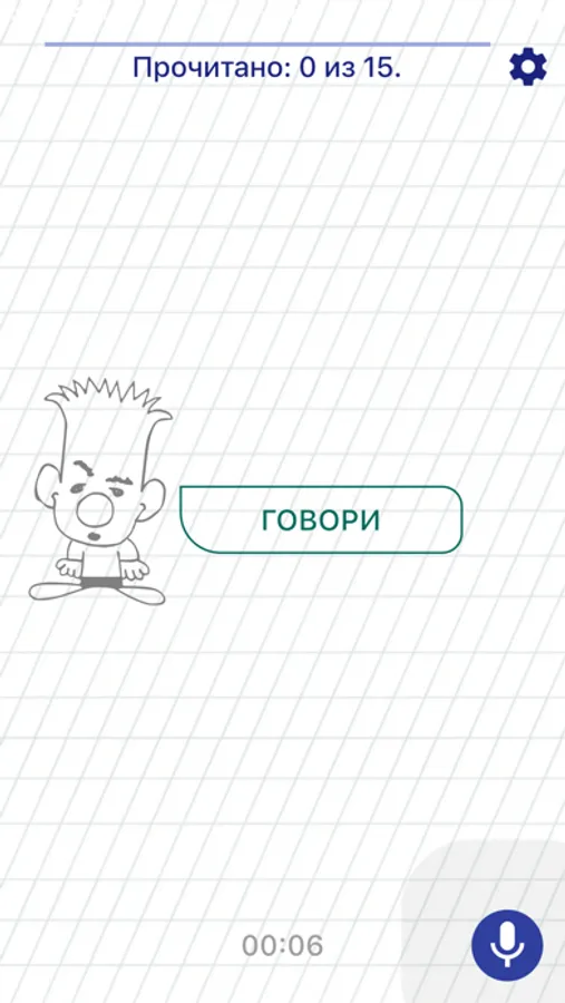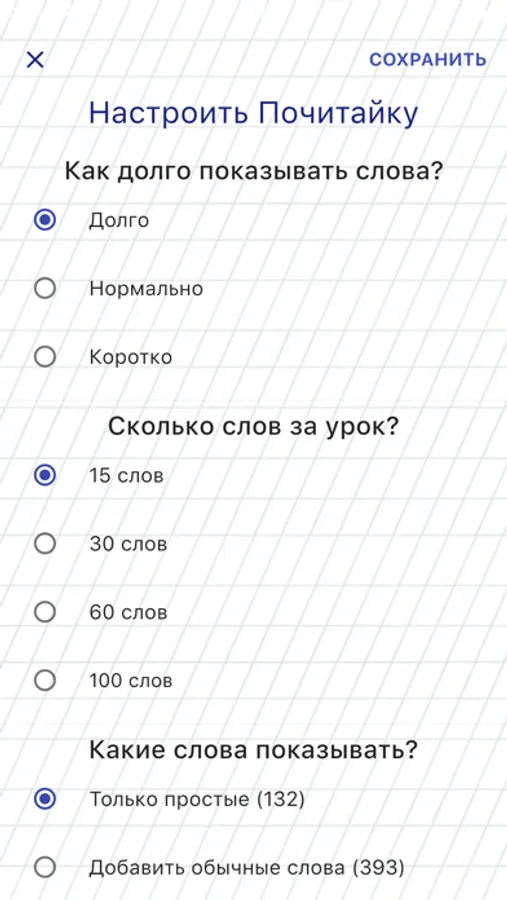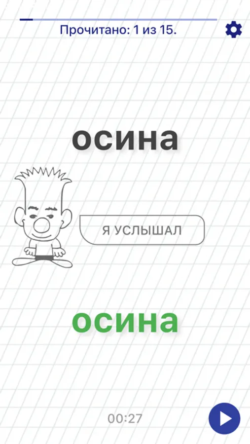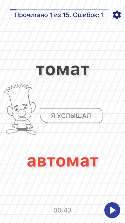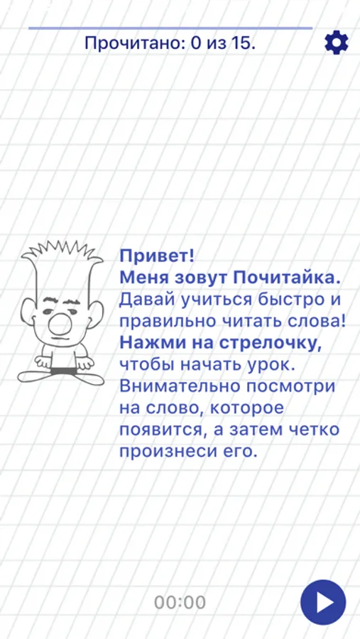 Приложение позволяет ребенку самому решать когда читать следующее слово, однако работающий секундомер добавляет в процесс обучения спортивную составляющую.