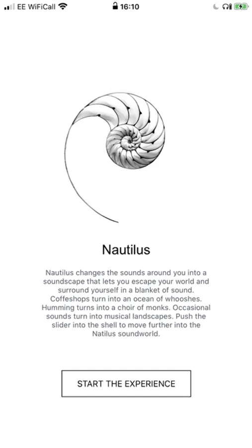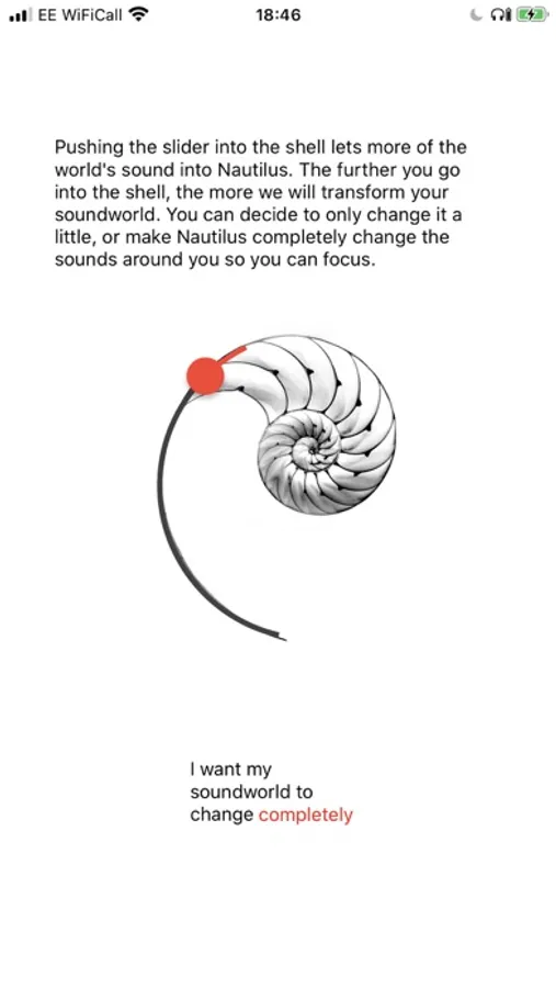 Nautilus changes the sounds around you into a soundscape that lets you escape your world and surround yourself in a blanket of sound. Coffeshops turn into an ocean of whooshes. Humming turns into a choir of monks. Occasional sounds turn into musical landscapes. Push the slider into the shell to move further into the Natilus soundworld.