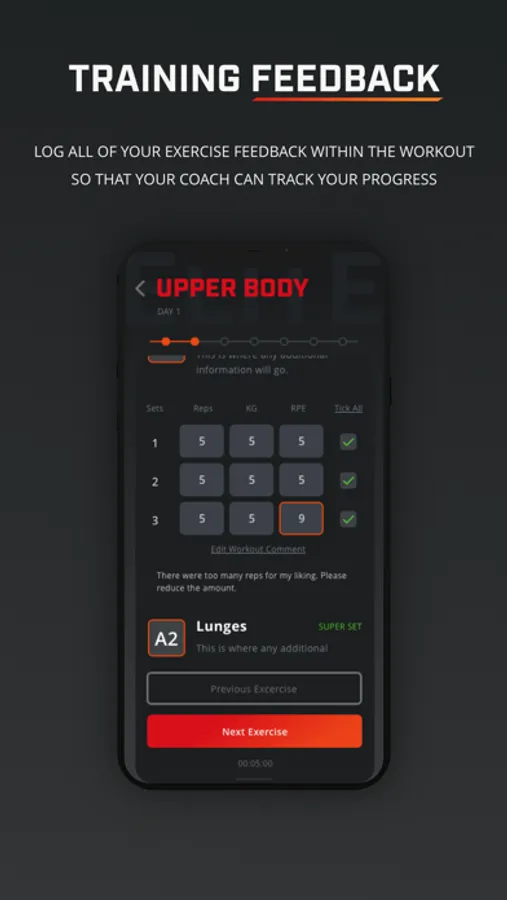 CoachElite allows athletes to easily view and log all of the workouts assigned to them by their coach. Athletes can also give detailed feedback on each and every exercise, right down to their achieved sets, reps, weight and RPE.
