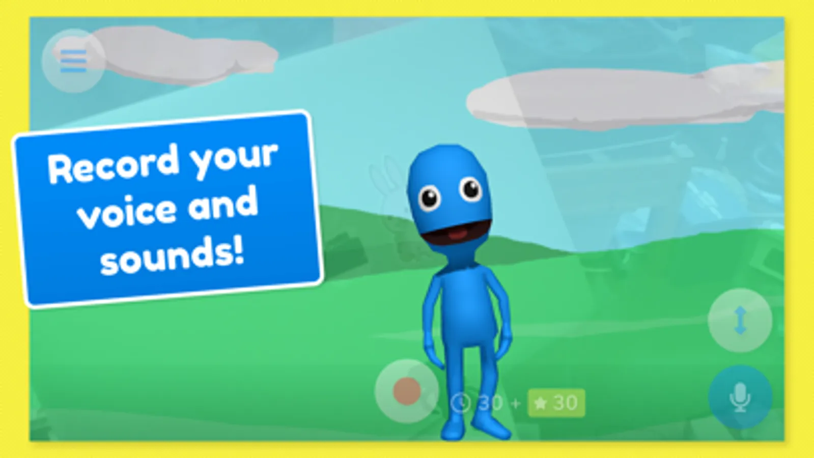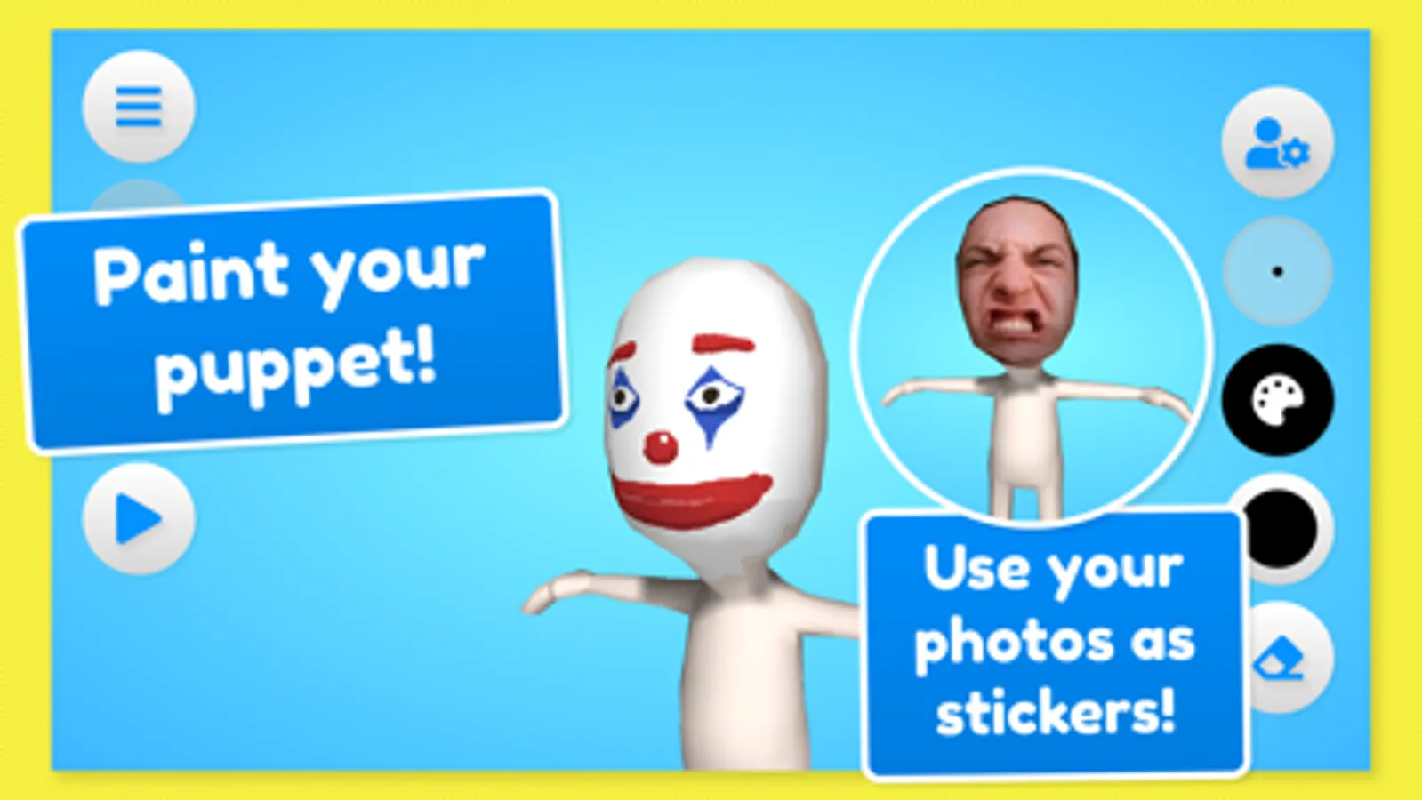 Using the built-in tools you can paint or even add your own photos to the puppets or background! Then you can bring them into the play area where you can interact with your puppets to create your own puppet show videos. Sound can be recorded through your microphone to add voices to your puppets or music!
