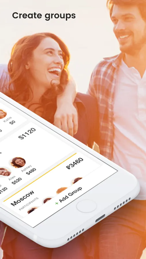 - create group with participants, select currency, upload avatars for participants or choose participant from contacts;