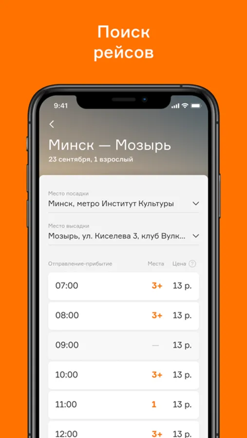 Приложение в режиме онлайн отображает все доступные варианты времени отправления, стоимость и количество свободных мест, а Вы выбираете нужные вам.