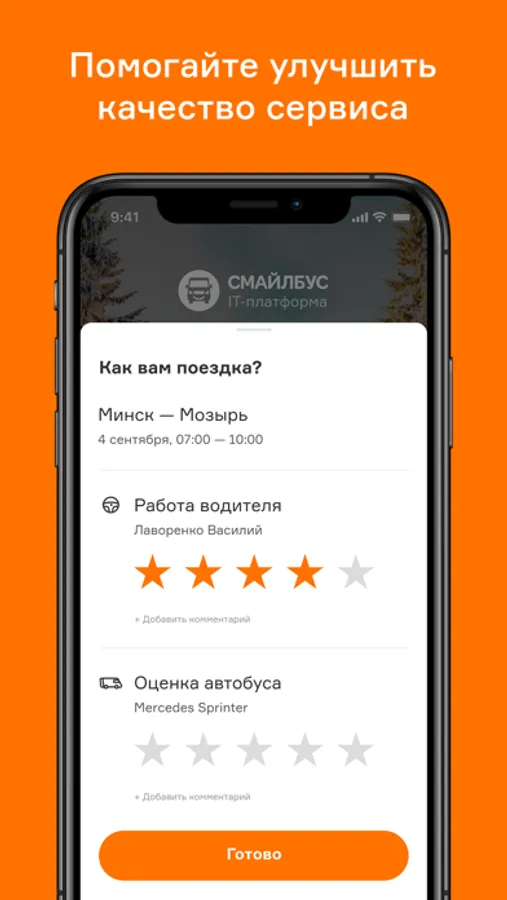 * вы можете оценить уровень комфорта автобуса и работу водителя, тем самым делая поездки ещё безопаснее.