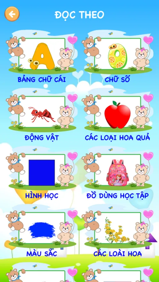 - Đọc theo (với chế độ chơi này, mỗi khi mở một chế độ, tên các đồ vật, chữ cái, con vật... sẽ được đọc lần lượt để cho các em có thể tiếp thu)