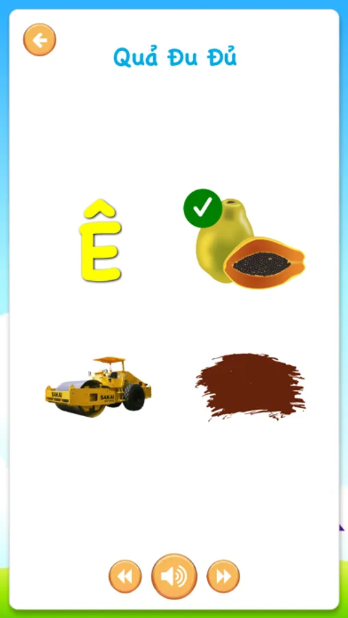 - Chế độ kiểm tra (Các đồ vật sẽ được hiển thị ngẫu nhiên, tên của đồ vật đấy được đọc lên, bé hãy chọn đáp án nhé)