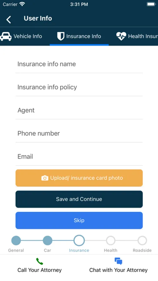 The core feature of our App is the ability to live chat with your attorney office to ask questions, get updates, and more. Our system allows you access into your favorite firm to store all drivers information for when you need it most. Store your drivers license, car insurance, roadside assistance, and more. Involved in an accident, have the ability to report ll new car accidents directly though our mobile app and instantly notify our legal team of what happened. Next chat with us for the next steps.