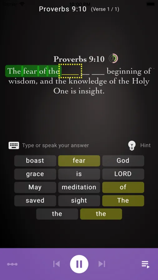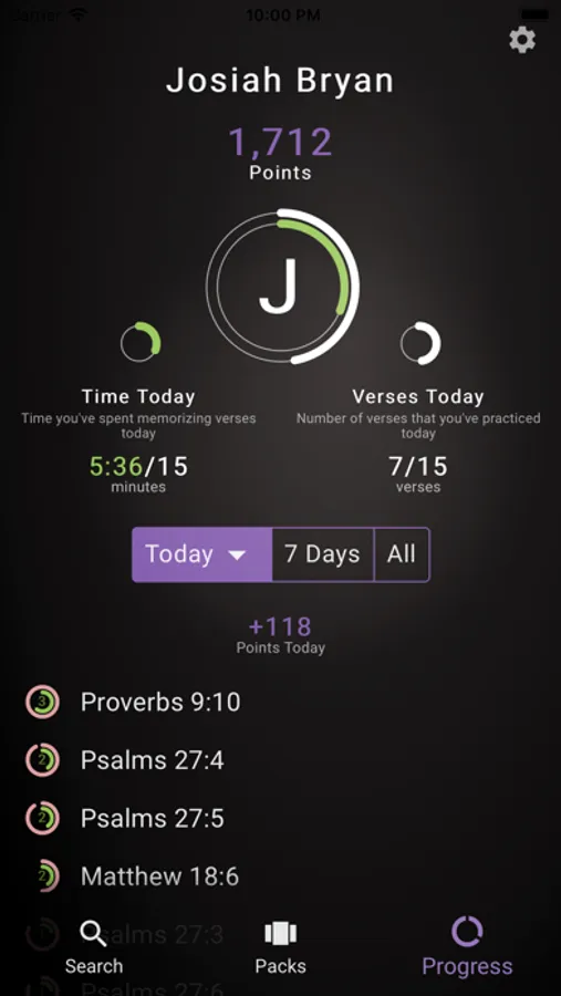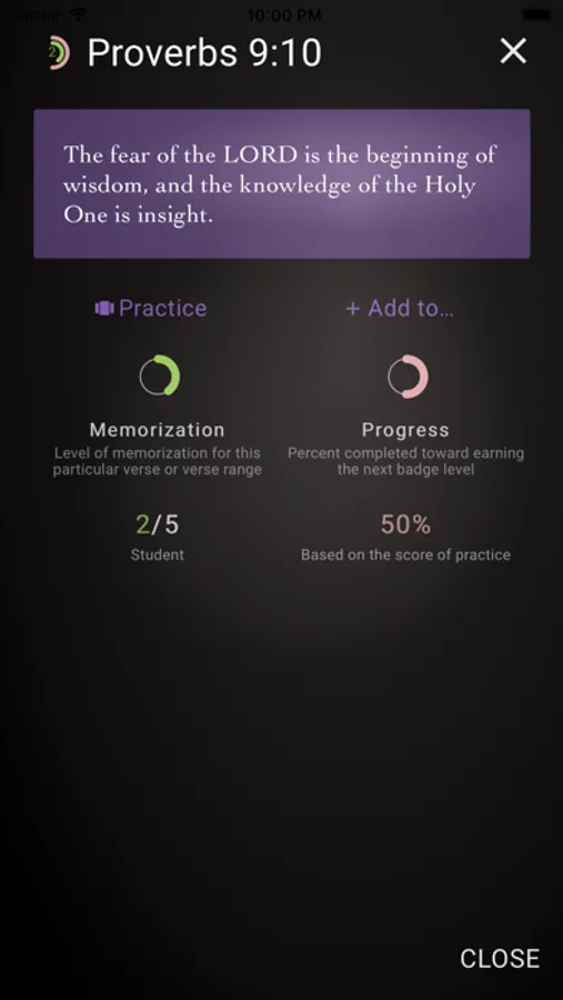 * Track Progress: See how well you did meeting your goals and improve every day! Earn badges for milestones and verses learned!