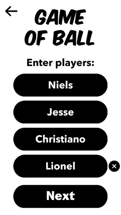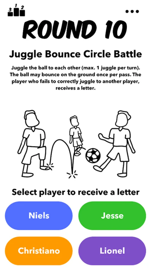 Every round the game chooses a randomized battle which will be a small competition between you and your opponents. Every battle will be explained in a short description and a small image. After the game is finished you click on the player’s name who lost that round's battle. Clicking on the lost player’s name will automatically add a letter of the word ‘BALL’ to that player’s name. After you have clicked on the lost player’s name, the game will continue to the next round. Once the full word ‘BALL’ is reached for one player, the battle is over. The game tells you what’s next for the lost player!