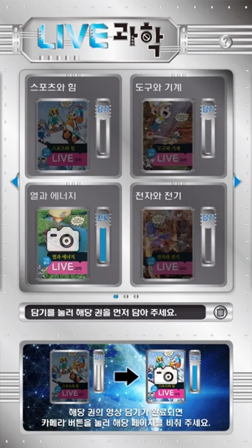 2. 앱에서 각 권의 콘텐츠를 담은 뒤 버튼을 눌러서 카메라를 실행합니다.