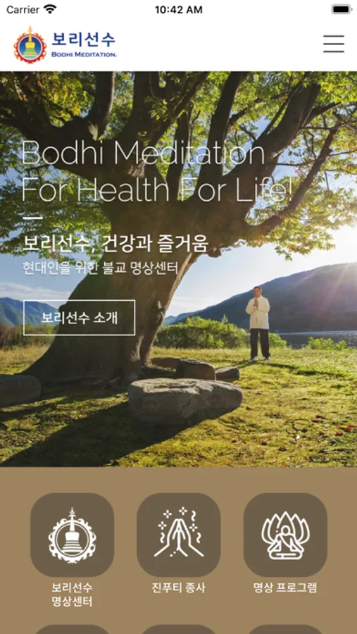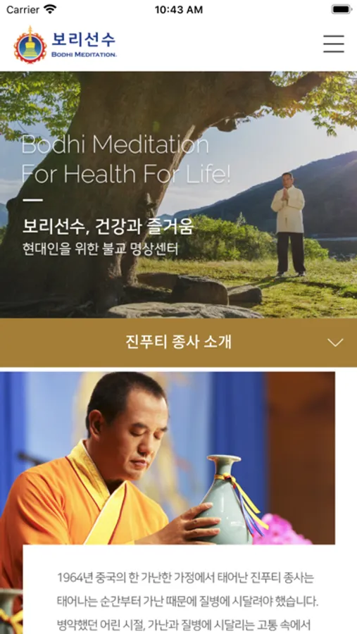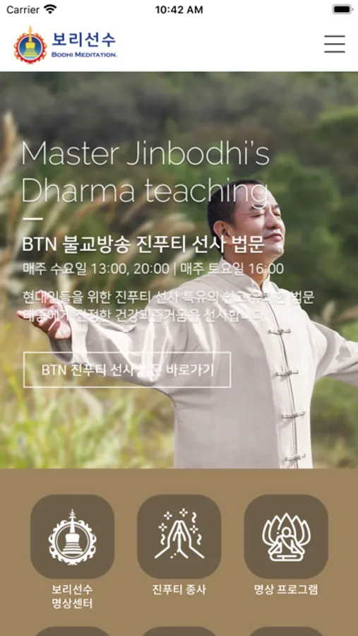 대광명수지법, 보리청정관상법, 염불법, 오체투지, 팔괘내공 등 Meditation Master 진푸티 선사의 특별한 명상법과 프로그램으로 성별, 연령, 문화, 신앙, 직업, 인종, 언어, 지역에 제한이 없습니다.