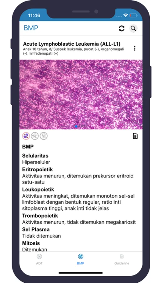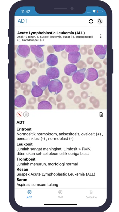 Aplikasi ini bertujuan untuk edukasi morfologi sel-sel darah pemeriksaan apusan darah tepi (ADT) dan apusan Bone Marrow Puncture (BMP) pada berbagai kasus kelainan sel darah. Aplikasi ini tidak bertujuan untuk diterapkan secara langsung pada kondisi klinis.