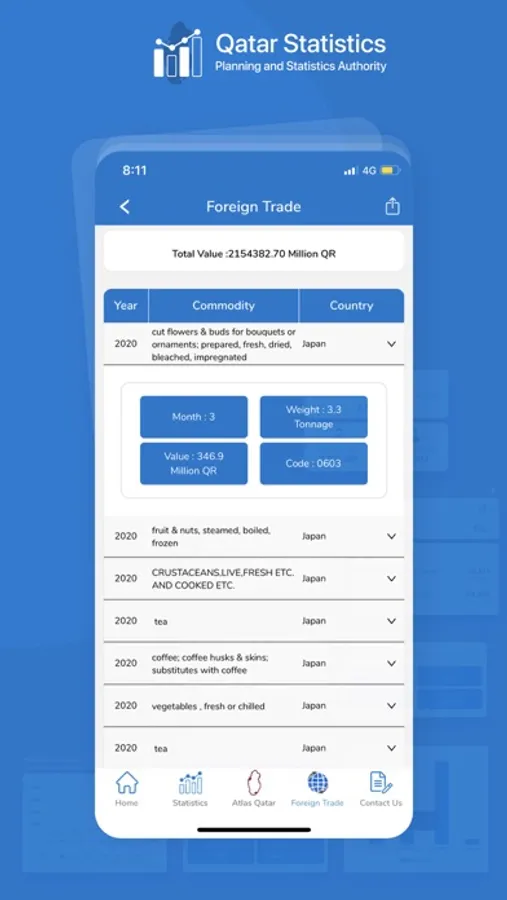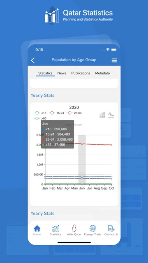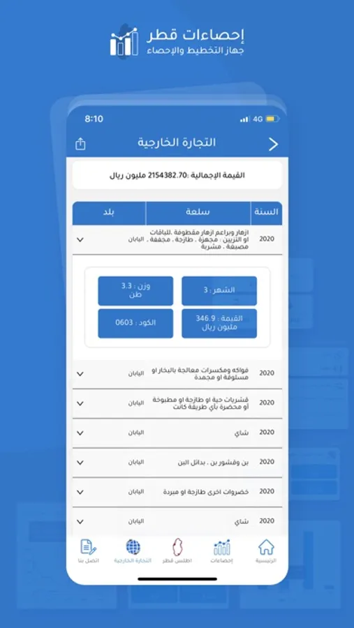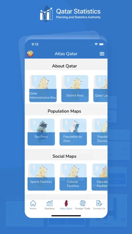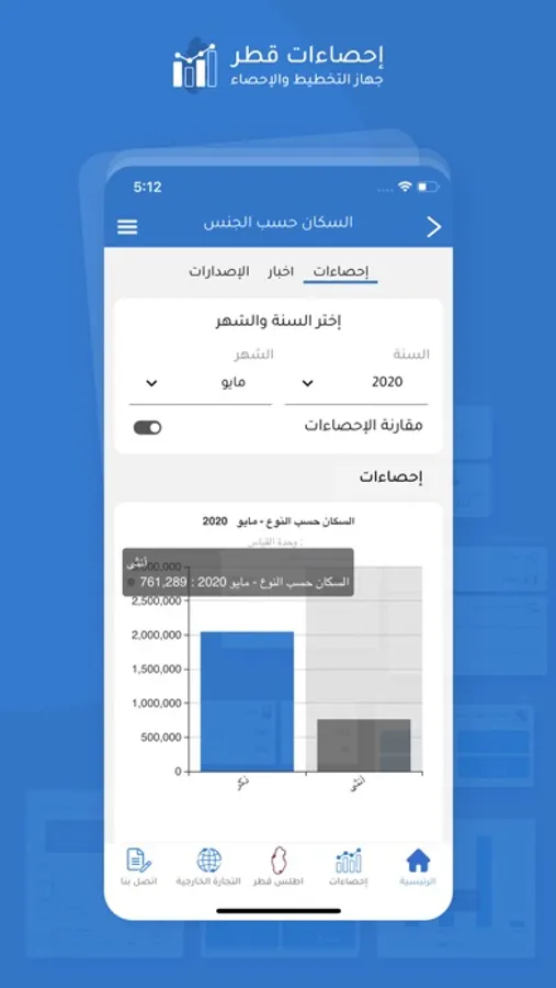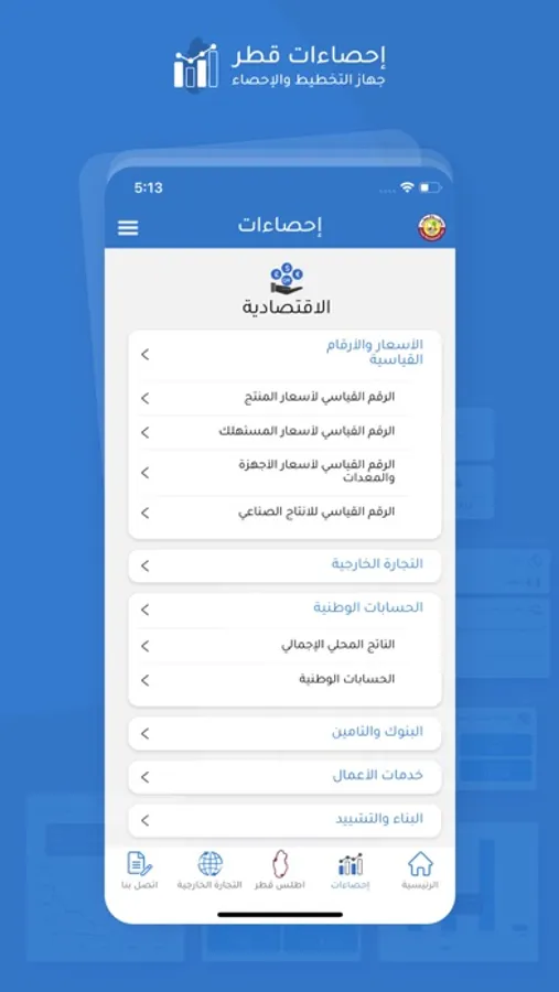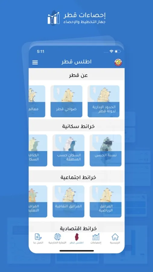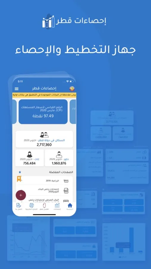 إحصل على آخر الاحصاءت السكانية، الإقتصادية، الإجتماعية،والبيئية من خلال تطبيق احصاءات قطر. يتم عرض البيانات على المستخدم بشكل واضح وسهل الإستخدام.