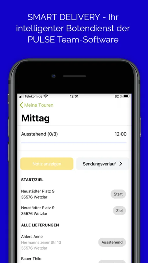 Die SMART DELIVERY APP der PULSE Team-Software steht für Funktionalität, Benutzerfreundlichkeit und innovative Funktionen. Dank dieser APP sind Ihre Boten immer in Echtzeit mit den wichtigsten Informationen versorgt. Das System errechnet automatisch die kürzesten Lieferwege, umfährt Staus und zeigt dies dem Fahrer übersichtlich in der APP an. Der Lieferstatus (erfolgreich abgeschlossen oder fehlgeschlagen) inkl. individueller Notiz wird dem Auftraggeber im Webportal oder auf dem Smartboard angezeigt. Der Endkunde erhält auf Wunsch Kurznachrichten (SMS), die ihn über den Lieferstatus informieren. Auch die Boten werden über Änderungen informiert, sollten kurzfristige Änderungen der Tour entstehen oder andere Serviceaufträge an den Boten geschickt werden. Sparen Sie Zeit und Geld, nutzen Sie die SMART DELIVERY APP der PULSE Team-Software!