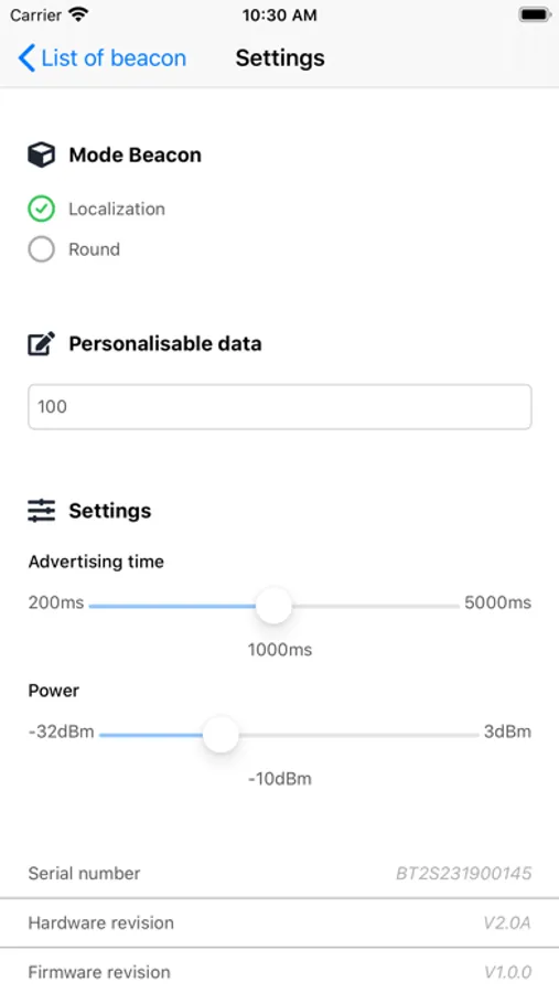 Based on Bluetooth Low Energy 4.2 protocol, this beacon application allows you to configure power of BT signal, transmission time, ID of Bluetooth beacon, 2 different working modes , maintenance patterns and to create easily a Bluetooth coverage for a room or an entire building.