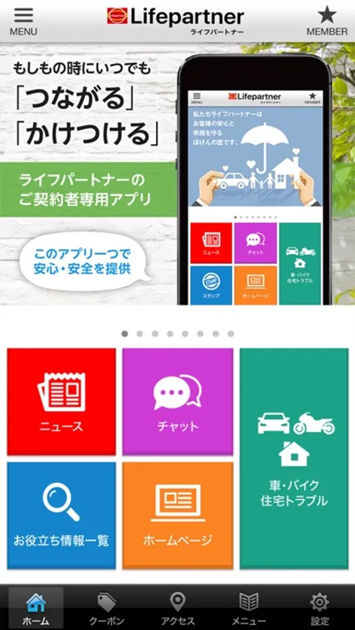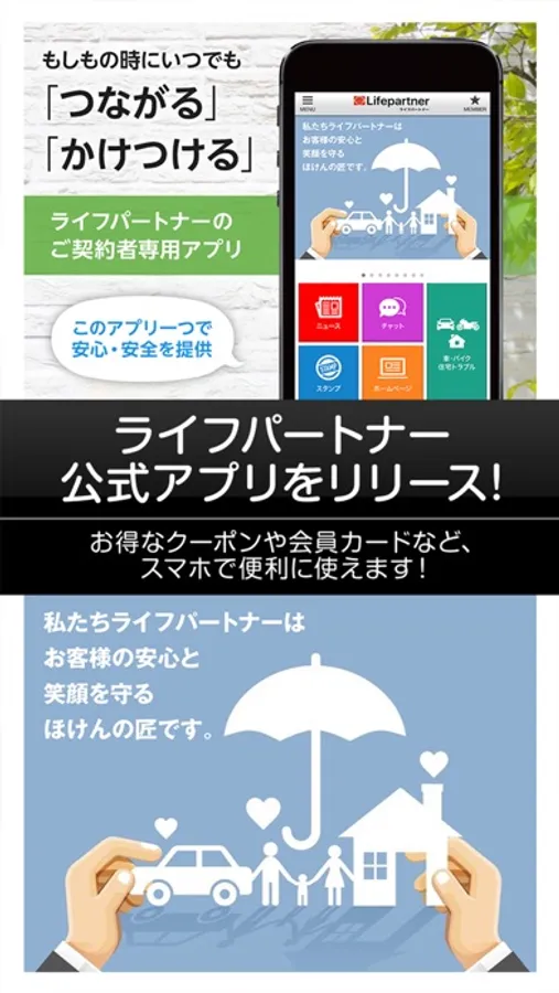 ライフパートナーのご契約者専用アプリは、もしもの時にいつでも「つながる」「かけつける」アプリです。