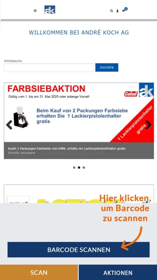 Diese App bietet zusätzliche Funktionalität wie z.B. das Scannen von Barcodes für den Shop "Andre Koch AG" an.