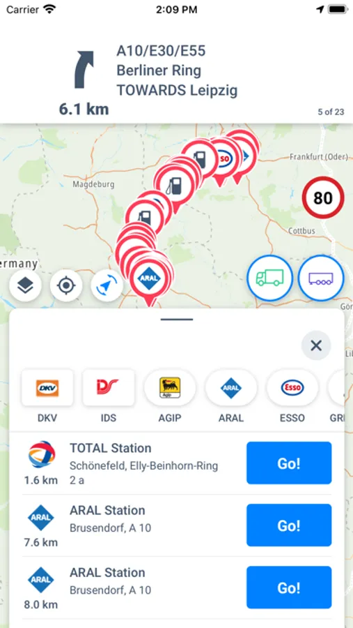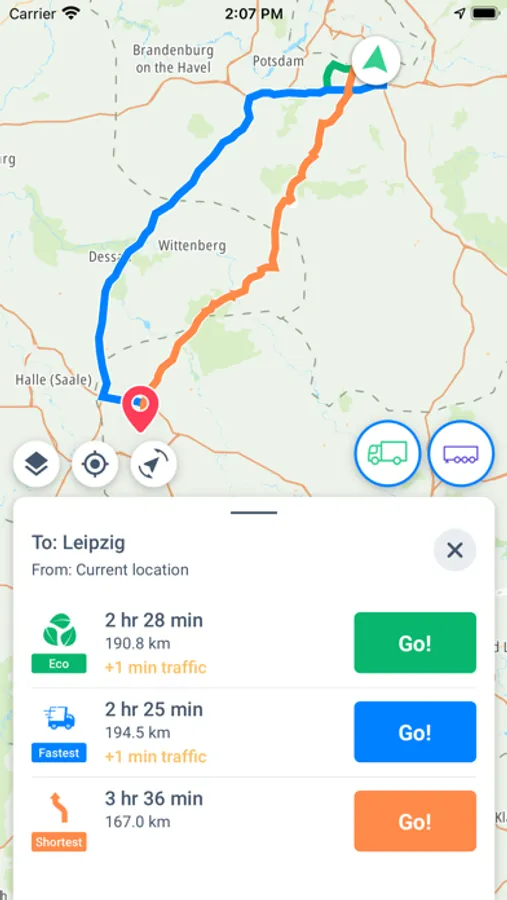 The app calculates multiple routes based on the fuel economy, duration and length and allows you to choose the most appropriate for your trip.