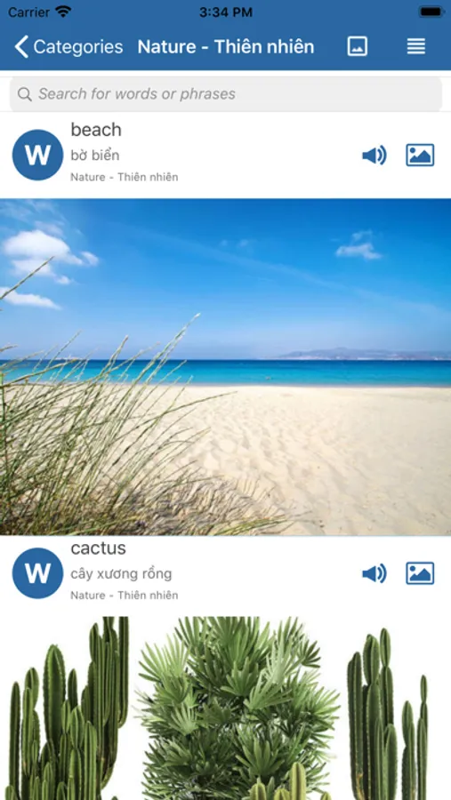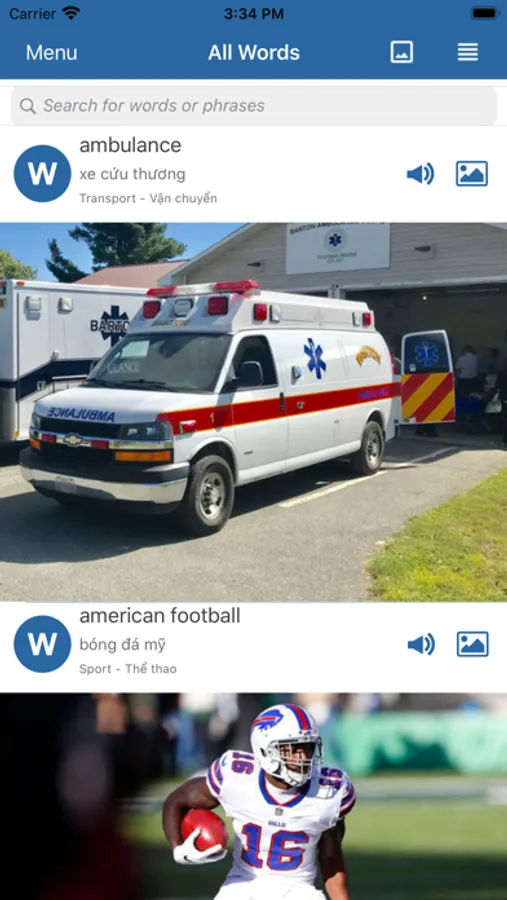 Also, this is a good application to learn English words offline. You can see pictures linked to words, hear the pronunciation and memorize them.