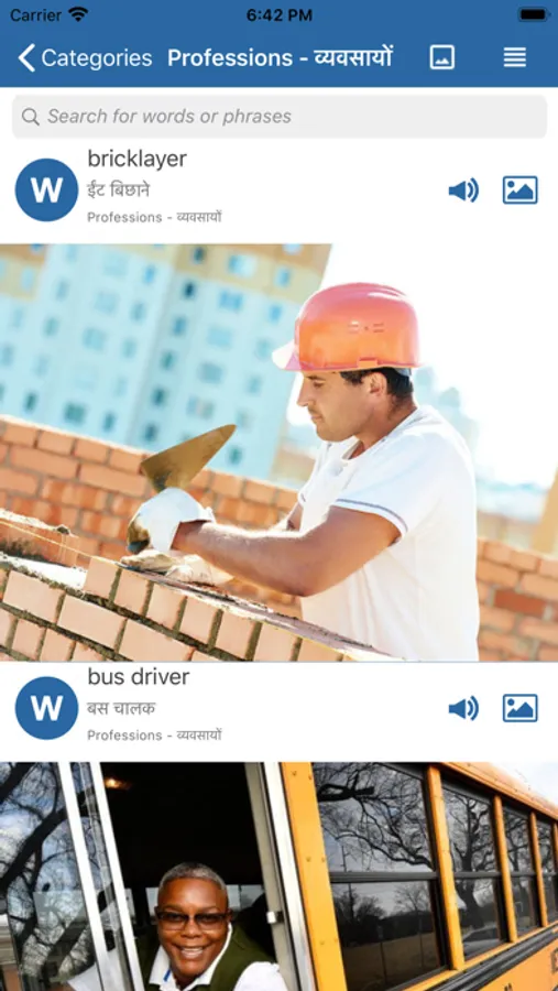 English dictionary can show offline more than 2000 most popular English words and high-quality real pictures in 21 categories Food, Kitchen, Hotel/home, Animals, Essentials, Colors, Nature, Body, Medicine, Sport, Devices, Clothes, Transport, Mathematics, Construction, Musical instruments, Army, School, Professions, Actions, Places, and others.