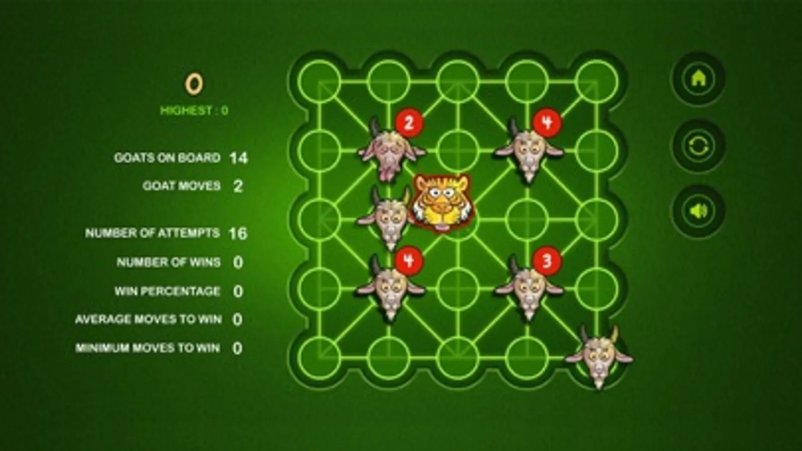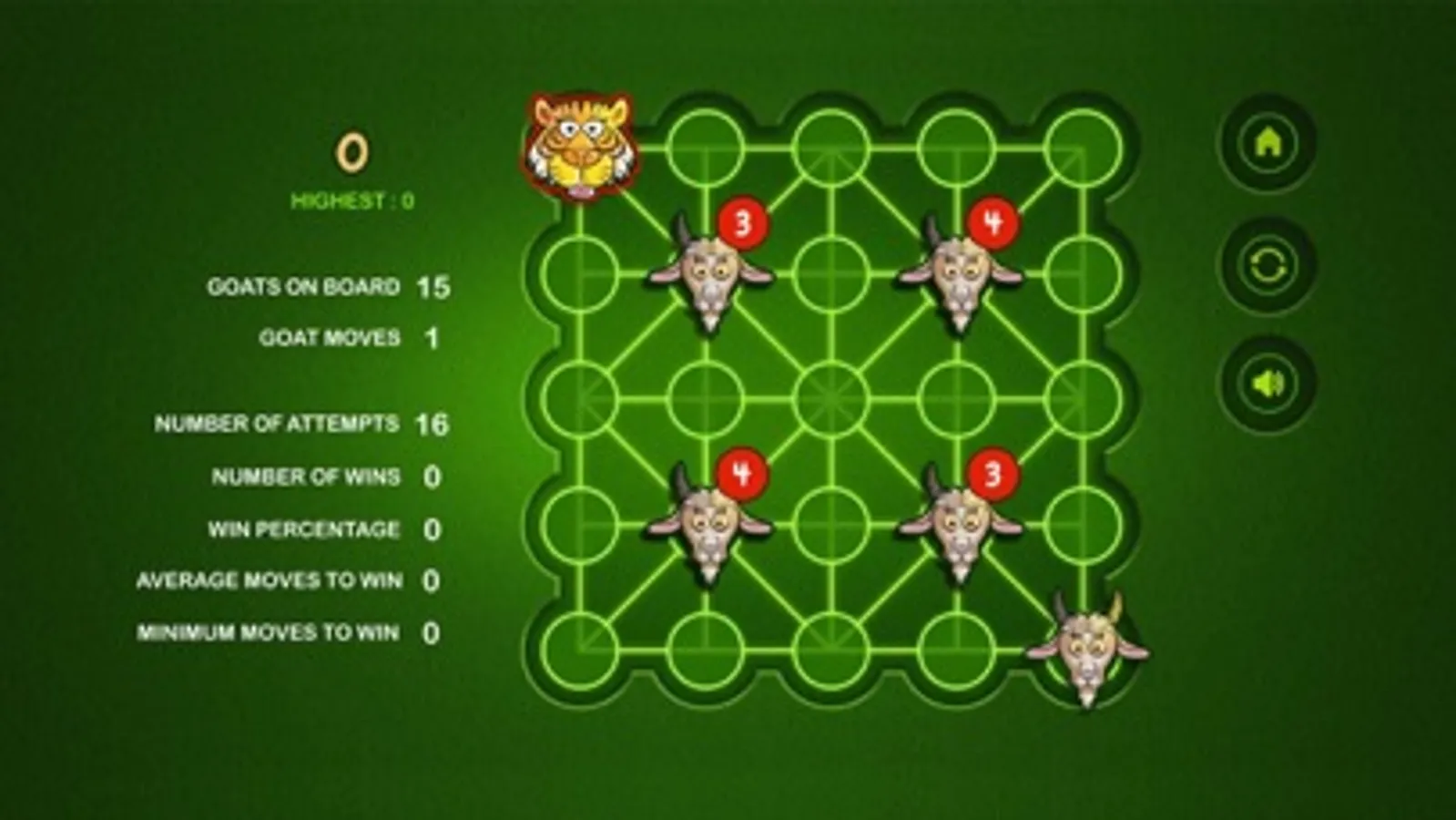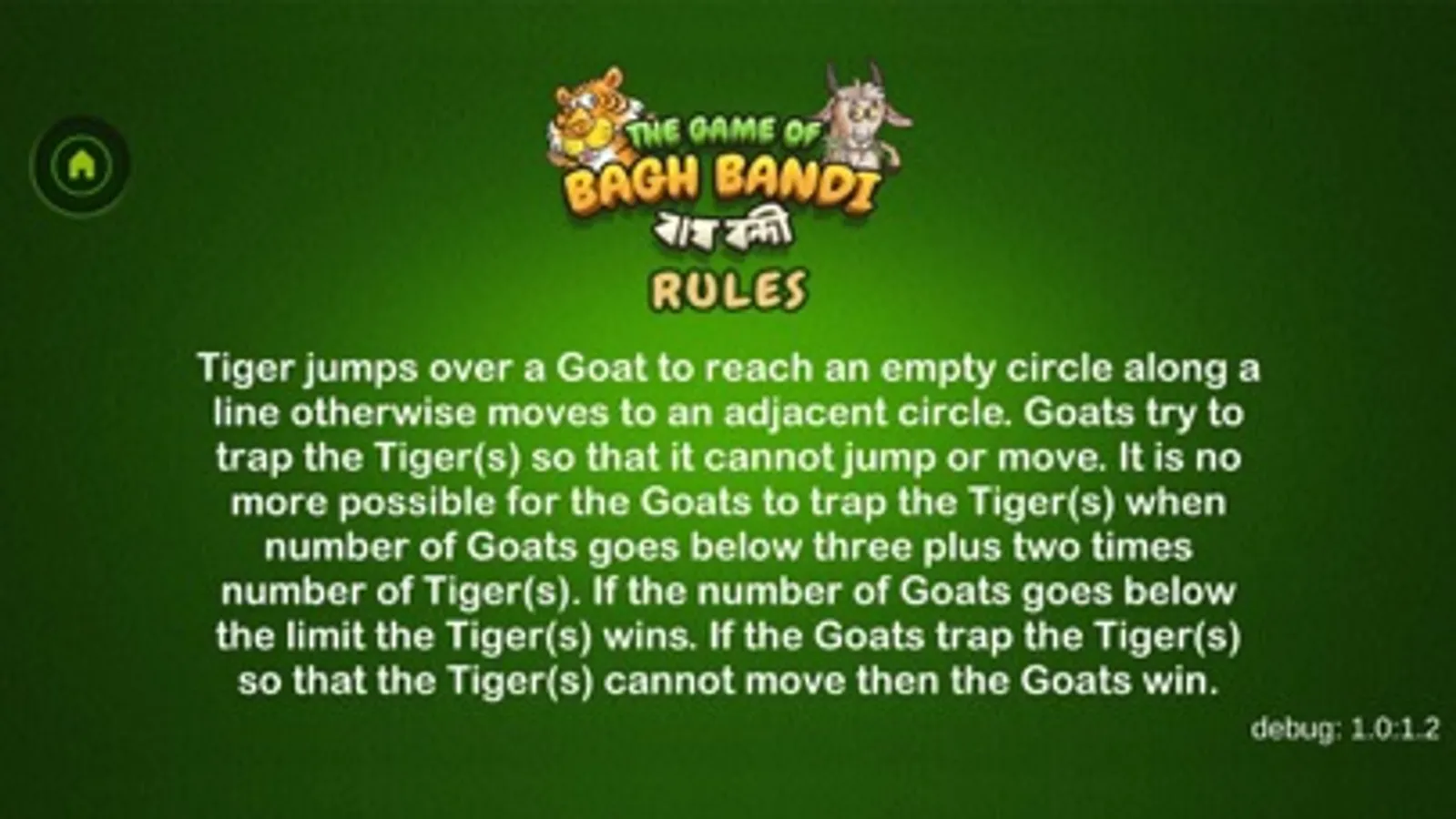 The Game of Bagh Bandi is an Indian strategy game known as Bagh Chheli in Northern India and as Bagh Bandi in Bengal. The game is played in turn between the tiger and the goats. It's basically a two person complete information game with no luck factor. The number of tigers can be chosen between one and five. The initial number of goats increases with the number of tigers. The goal of the herd of goats is to trap the tiger so that it cannot move any more while the tiger tries to kill or escape. I have kept the board unaltered while tamed the rules a bit for simplification. The reference is available in Wikipedia. Wish you enjoy the game.