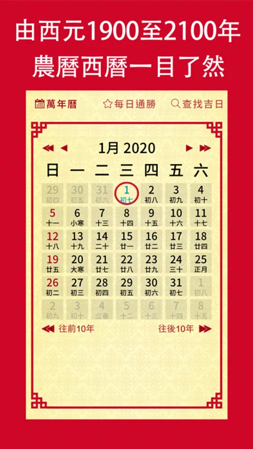 萬年曆:內建1900-2100年的萬年曆,讓你隨時查看相關日期。