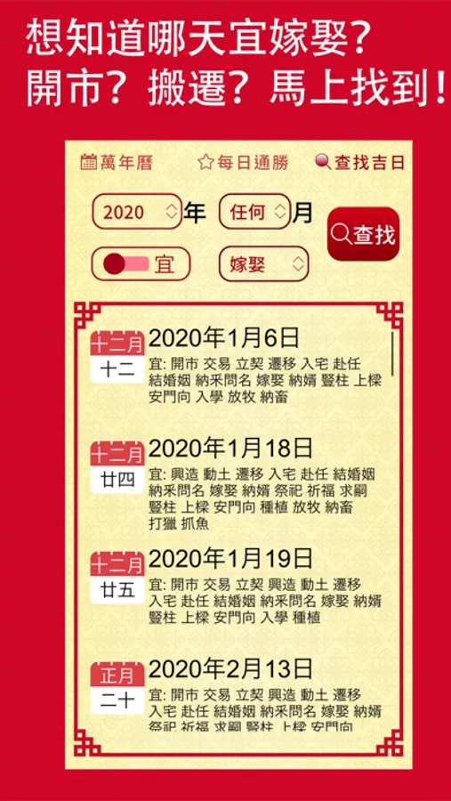 事項搜索:快速找到適合的日子,如結婚、祭祀先祖、開市交易等。