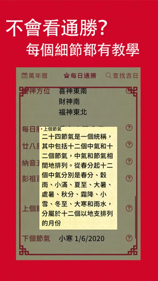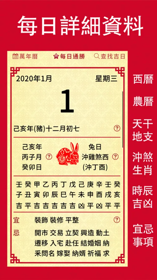 吉凶宜忌事項:每日詳細資料,提供相應解說功能。