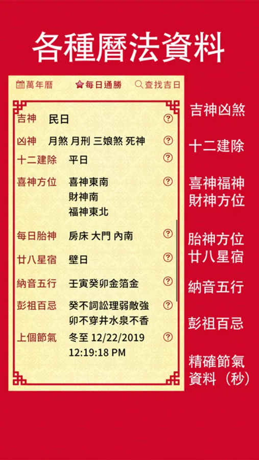 每日時辰吉凶、常用吉神凶煞、建除十二神、每日相沖生肖、沖煞方位、喜神方位、財神方位、福神方位、每日胎神方位、二十八星宿、納音五行、彭祖百忌。