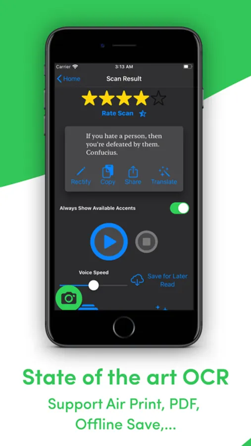 • Automatically Recognize the Input Language & Speaks your Accent: Once the scanned image (Book page, magazine, journal, scientific paper, etc.) recognized & transformed into text content, you'll be able to playback that text in your local accent & over 45 languages of your choice!