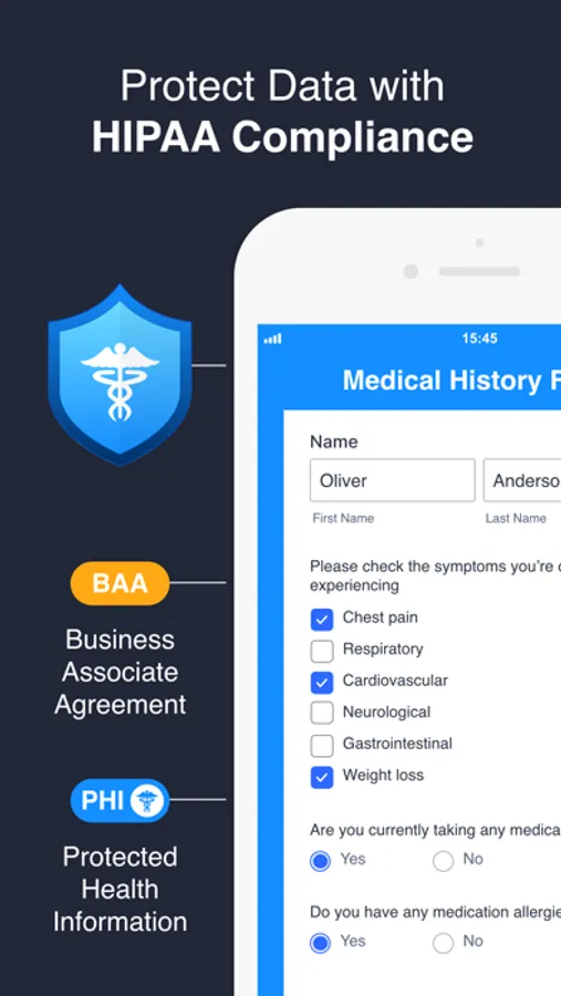 Our HIPAA-compliant forms encrypt submission data automatically, guaranteeing the privacy of your patients' health information. You'll also receive a signed Business Associate Agreement (BAA) that creates binding liability and keeps your business protected.