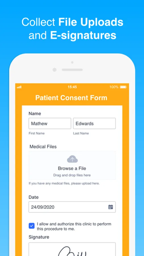 Patients can easily sign your forms with legally-binding electronic signatures and attach important medical documents, images, and other files.