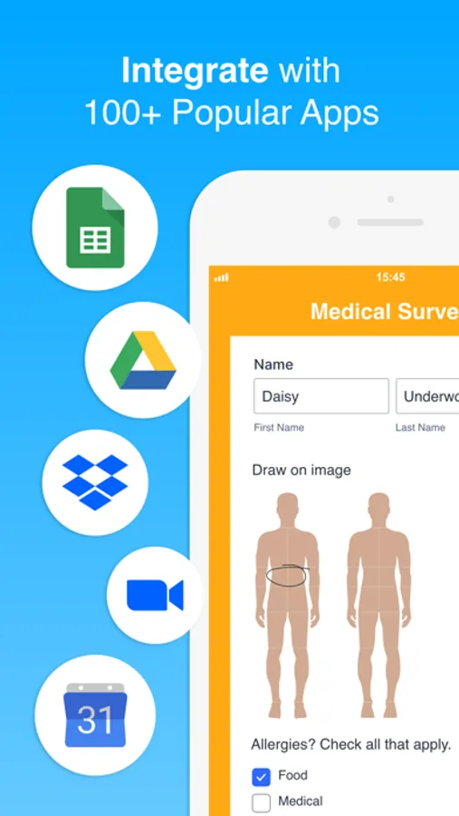 Connect your forms and surveys to HIPAA-compliant software like G Suite and Dropbox to sync submissions automatically and make patient data more organized and accessible for your team.