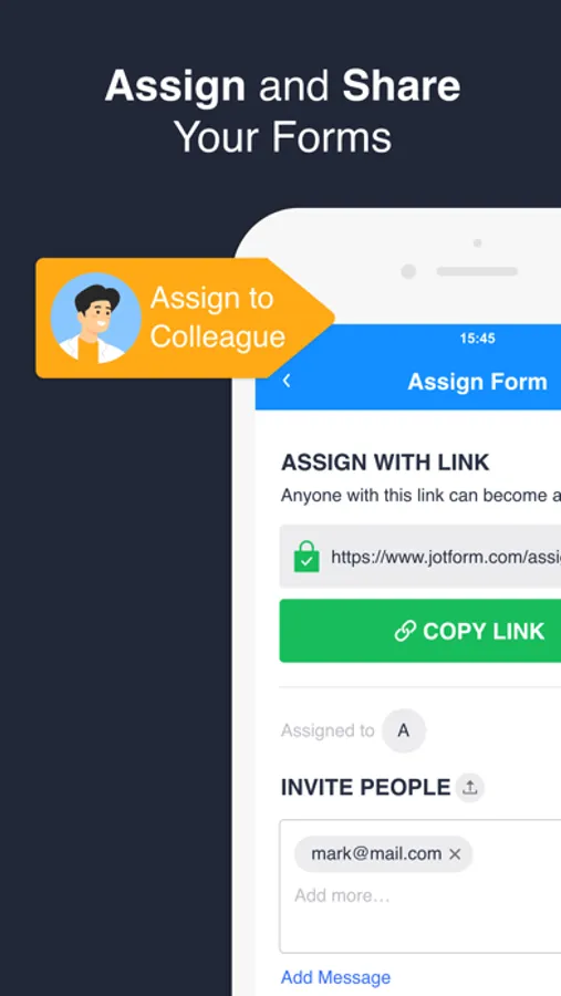 - Share forms via email, text, and other mobile apps (Facebook, Slack, LinkedIn, WhatsApp, etc.)