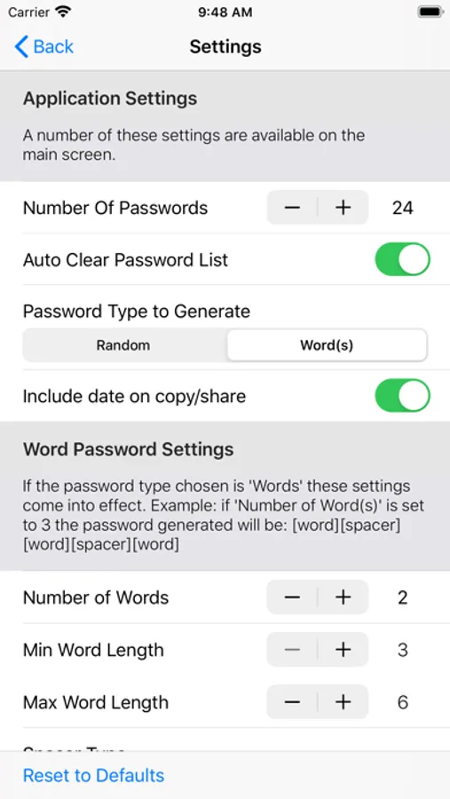 • Type of spacer between words, none, hyphens, mixed random characters, or user defined spacer(s).
