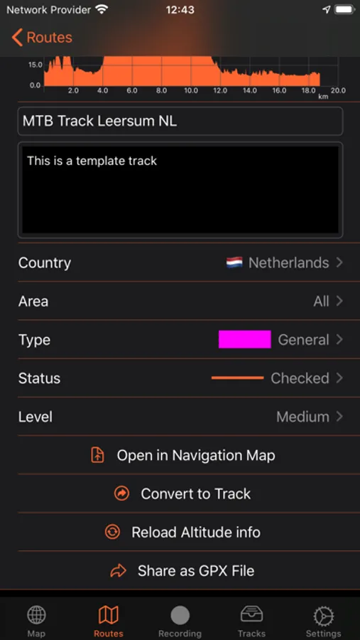 Routes and tracks can be categorized by Country, Area, Type, Status and Level. With the build in Editor, Tracks can be added and changed too.
