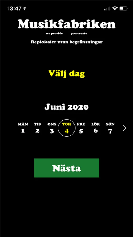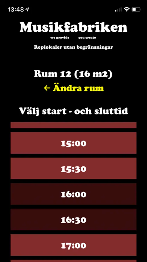 Musikfabriken i Göteborg erbjuder replokaler som man kan hyra in sig på under valda tider. I denna appen kan du snabbt och enkelt boka ett rum.