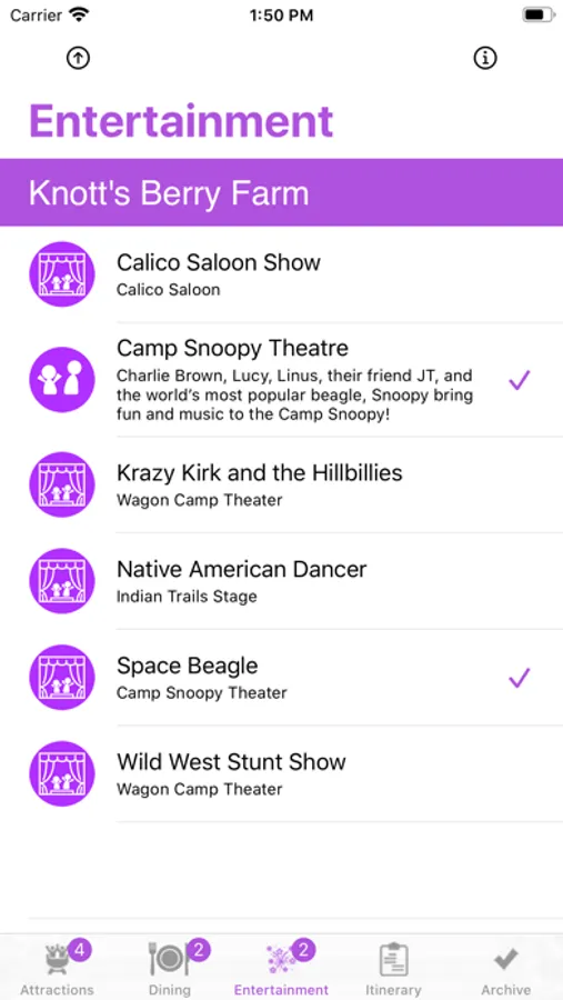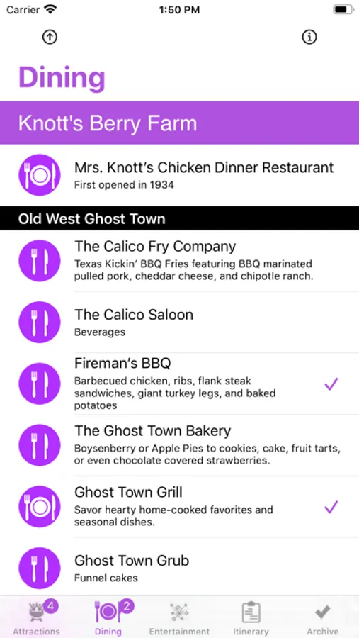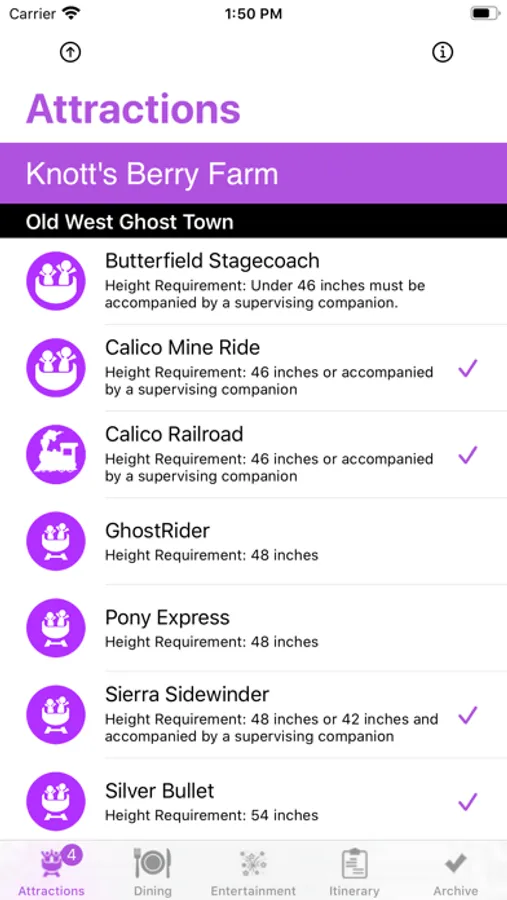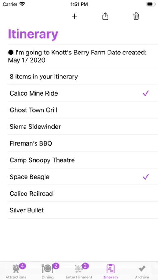 Theme Park Checklist is a TravelGuide checklist app for preplanning, checking off, or highlighting experiences during your trip. You can create an itinerary list and archive your trips too. Plus you can share your itineraries or archived checklist with friends and family.