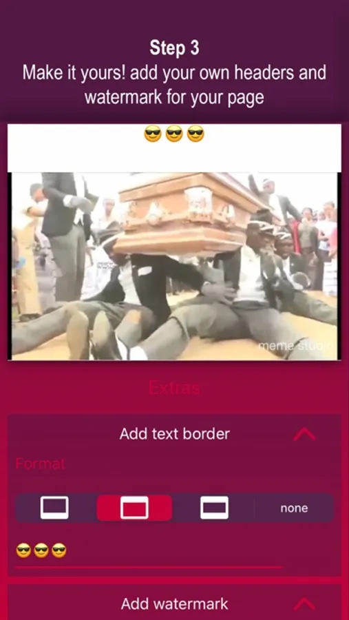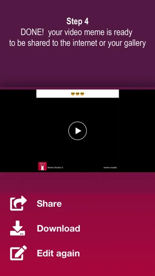 Add a meme to the end of your videos. Just select the clip that you want to use and choose your own video so Meme Studio X can generate memes merging both of your videos.