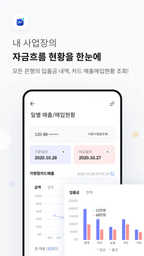 거래 중인 모든 은행의 거래내역과 매출/매입 현황, 카드승인부터 계좌입금현황까지 확인할 수 있습니다.