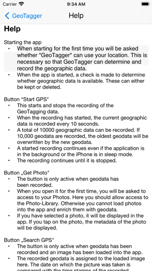 A total of 10,000 geodata can be recorded with GeoTagger. This is usually enough to be able to add geo-data to all trips of a 3 - 4 week vacation.