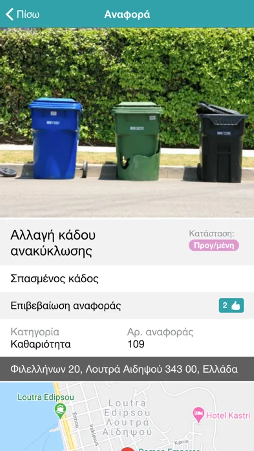Ενημερωθείτε για την πορεία της αναφοράς σας, μέχρι την οριστική διευθέτησή της από την αρμόδια υπηρεσία του Δήμου Ιστιαίας-Αιδηψού.